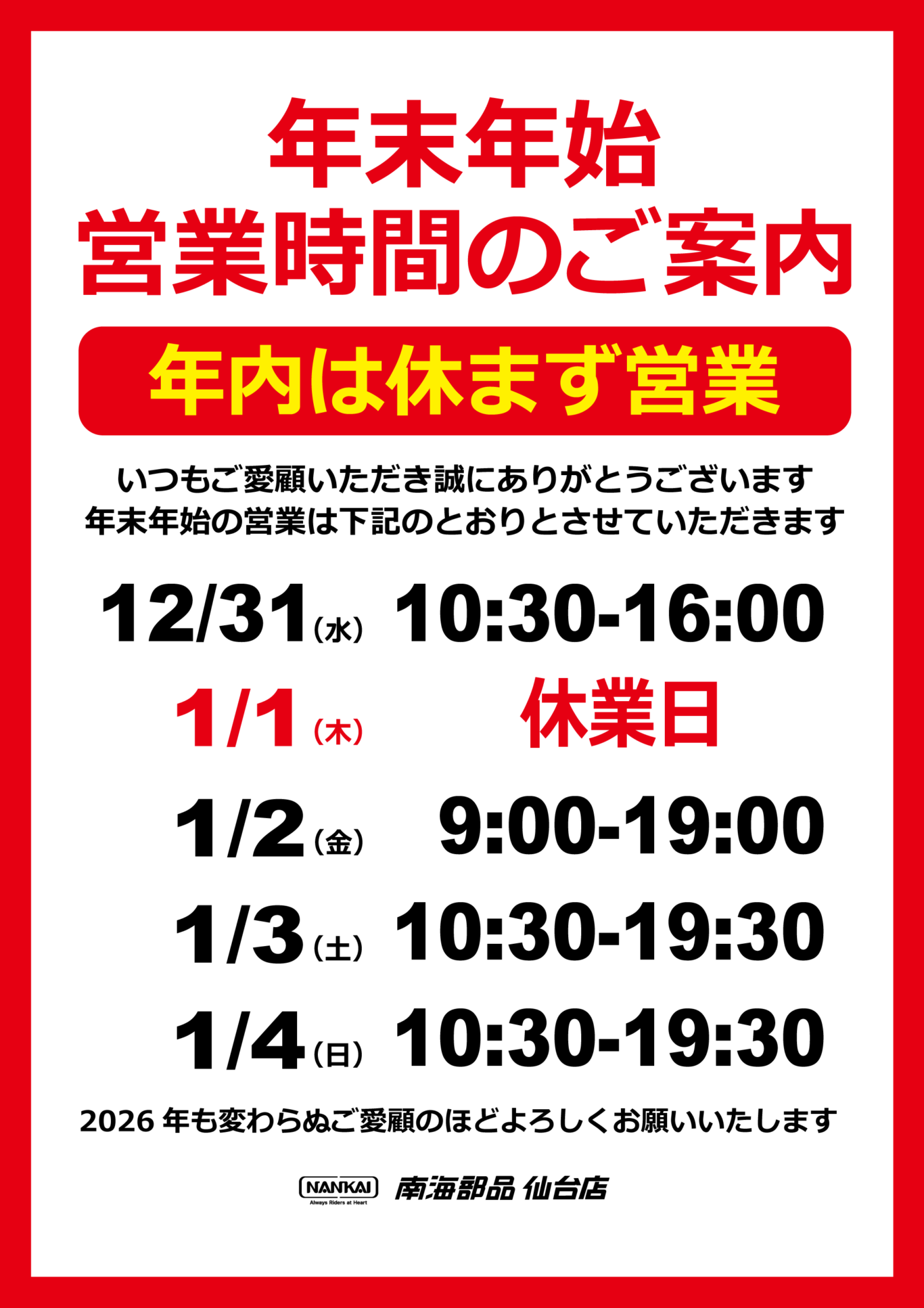 いつも南海部品 仙台店をご利用いただき、誠にありがとうございます。