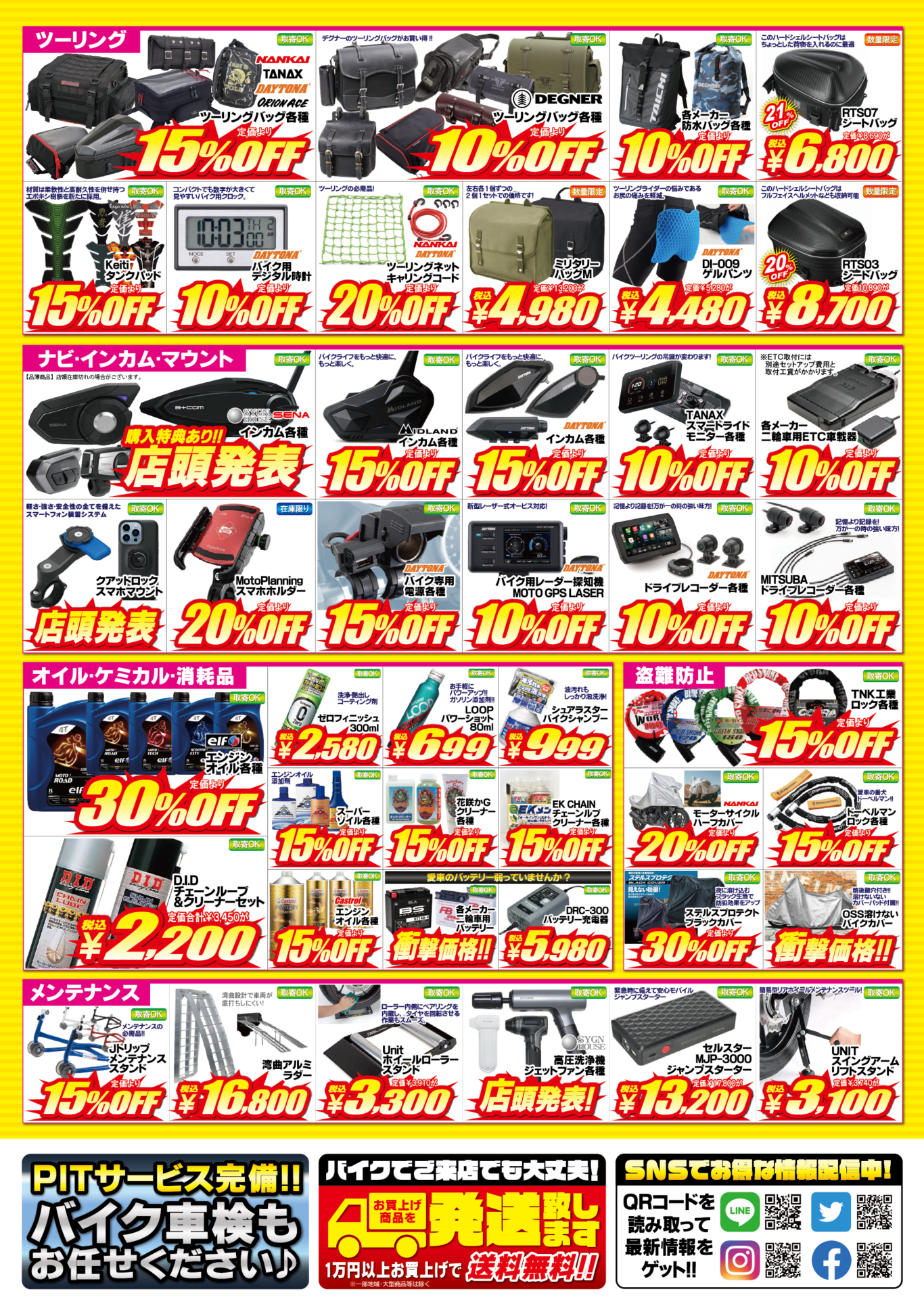 さらに、税込1万円以上のお買い上げで送料無料対応。バイクでご来店のお客様でも安心してお買い物いただけます。