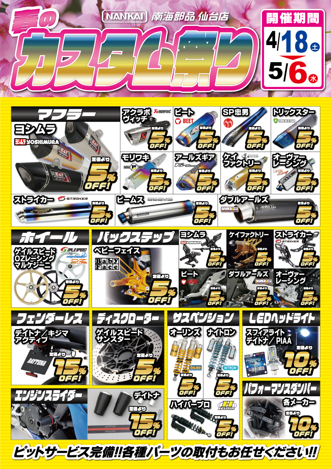 南海部品仙台店では、春のバイクシーズンに合わせて「春のツーリング応援セール」と「春のカスタム祭り」を同時開催いたします。